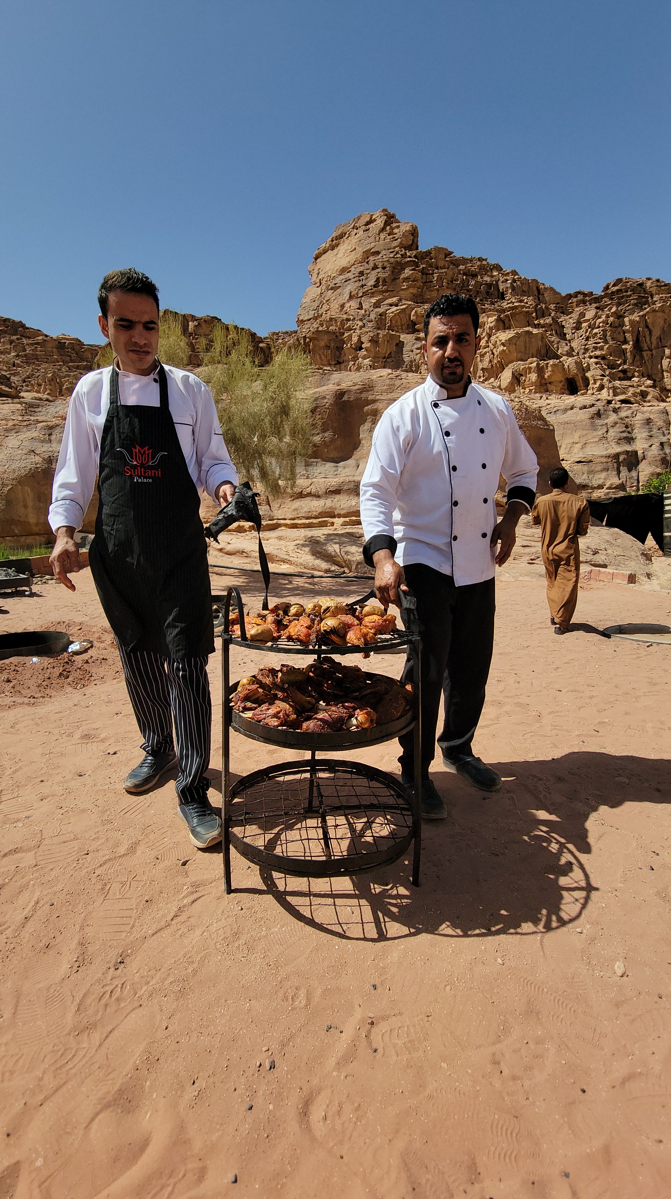 Back in the truck, the only thing left to do was have lunch. We ventured to our lunch spot and were treated to a presentation of how the locals cook zarb. A pit is dug in the ground and filled with hot coals. The food is lowered into the pit, buried in the ground, and left to cook.