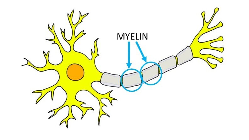 Myelin: An insulating sheath that forms around nerves to allow electric impulses (messages) to transmit along the nerve cells. If damaged, messages between the brain and parts of the body may be slowed or stopped completely.