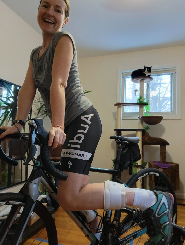 Walking in my new AFO was not possible. It hurt. The hard plastic would scrape the back of my heel with every step. It was excruciating. I taped padding across the problem areas. It made no difference. I did not understand. The back of the heel was open to prevent this very problem. I told myself I just needed to “break it in” and forced myself to step out the front door and head toward the sidewalk. I never made it more than fifty steps in that AFO. However, all was not lost. I decided to slip it into my cycling shoe and see what happened.