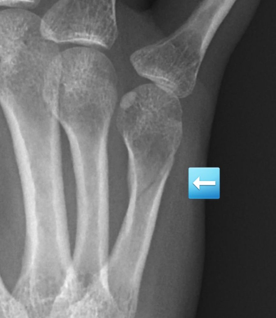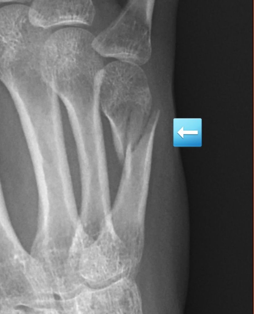The x-ray confirmed a nondisplaced fracture of my fifth metacarpal, the bone in your hand that attaches to the pinky finger. I was bummed about not getting to use my new exerciser, but happy that the fracture was small and should have no issues healing.